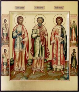 Светоза́рную тро́ицу святы́х му́чеников восхваля́юще, ве́рнии, устрани́мся ра́спрей и раздо́ров в жи́зни сей, убежи́м несогла́сий и разделе́ний в Правосла́вней ве́ре и храня́ще едине́ние ду́ха в сою́зе ми́ра, из глубины́ души́ воскли́кнем та́ко: