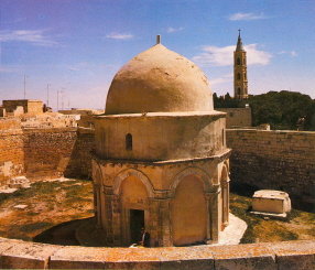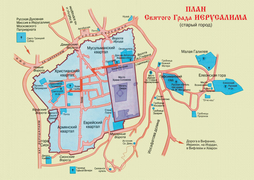 «Не умолкну ради Сиона, и ради Иерусалима не успокоюсь, доколе не взойдёт, как свет, правда его, и спасение его- как горящий светильник. И увидят народы правду твою и все цари- славу твою, и назовут тебя новым именем, которое нарекут уста Господа.» (Исаия 62:1-2). Святая гора Сион краеугольным камнем зиждется над Иерусалимом. Старый город спадает от неё к Кедронскому потоку, обнажая взору с Елеонской горы свои плосковерхие жилые дома, многокуполье храмов с колокольнями, мечеть Кубет эс – Сахра, или мечеть Омара, гигантский золочёный купол которой стал визитной карточкой Иерусалима и его достопримечаткльности не оставят Вас равнодушными. Под его сводами находится заветный камень, на котором совершал своё легендарное жертвоприношение святой праотец Авраам. Евреи верят что именно с этого камня Бог начал творить мир. Затем камень был используем Орном иевусиянином для гумна. На этом камне остановился ангел смерти, посланный на израильтян за грех Давида — царя. И Бог через пророка Гада повелел здесь соорудить священный жертвенник. Сын Давидов Соломон сооружает на месте сем храм Господу и на священном камне поставляет ковчег Завета. Когда храм отстраивает Ирод Великий, в Святая Святых отсутствует главный предмет поклонения и, тогда промыслом Божиим в Святая Святых вводится невинная отроковица Мария, ставшая Ковчегом для прихода Спасителя мира. Здесь же был встречен Богомладенец старцем Симеоном и пророчицей Анной, возвестившими о великой миссии Новорожденного. В стенах храма звучала проповедь Христа: «Когда же увидите Иерусалим, окруженный войсками, тогда знайте, что приблизилось запустение его:…потому что это дни отмщения, да исполнится всё написанное»( Ев. от Луки 21,ст.20-22). «Бегите, дети Вениаминовы, из среды Иерусалима,… ибо от севера появляется беда и великая гибель. Разорю Я дочь Сиона, красивую и изнеженную» (Иеремия 6, ст.1,2). Запустение святого места случилось в начале 70-х, когда полководец Тит, взяв город силой, разрушил храм, а император Адриан соорудил на Мориа капище посвящённое Юпитеру Капитолийскому и Иерусалим переименовал в Элиа Капитолина. Иудеи и христиане уже не могли даже подходить к своему священному городу — он более не был их городом…